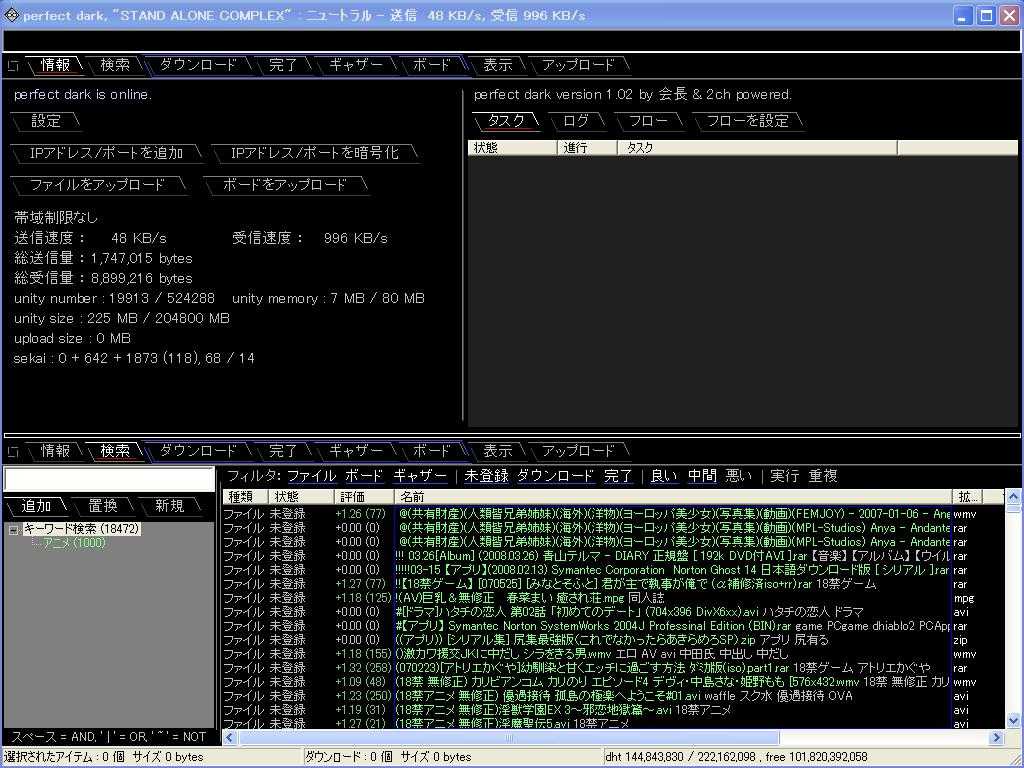 Winny・Shareに続くP2Pソフトとして、一部に期待されているPerfect Dark  Ver1.000になったので少し使ってみました。Ver 1.000からはBBS機能などが追加されて期待が高まっていきますが、ACCSはダウンロードしただけでもアップロード行為と見なすとか騒いでますね。ダウンロードのみでの逮捕者も出ているので、本当に有罪に出来るのか判決が気になりますね~。