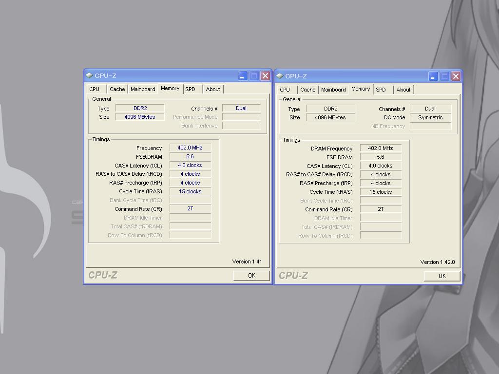左がCPU-Z 1.41で右が1.42です。見ただけでわかる変化は、MemoryのDC ModeがSymmetricと表示されるようになったぐらいです。他も変わってるのでしょうが、CPUIDにはまだ無いようなので詳細不明。