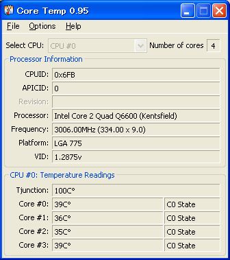 温度はアイドル時で、室内の温度は25℃前後。 BIOSの設定さえ間違えなければ、余程のハズレを引かない限りは3GHzは超えられるでしょう。このマザーでも、FSB380まではπ焼き程度では落ちませんでしたが・・・FSB400にすると起動しない(´д⊂)‥ハゥ倍率変えても駄目なので、マザーの問題でしょう。個人的な感想では、3.33GHz以上にするならば水冷必須って感じです。アイドル時は余り変わりませんが、負荷時の上がりが凄すぎる。